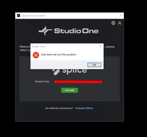 I shared an image below. I am installing Studio One through the Splice application. My automatic product code is coming. I am logging in with my PreSonus account and getting this error. I couldn't understand why I got an error, when I logged into the same Presonus account from the same Splice account before, the activation was completed immediately.