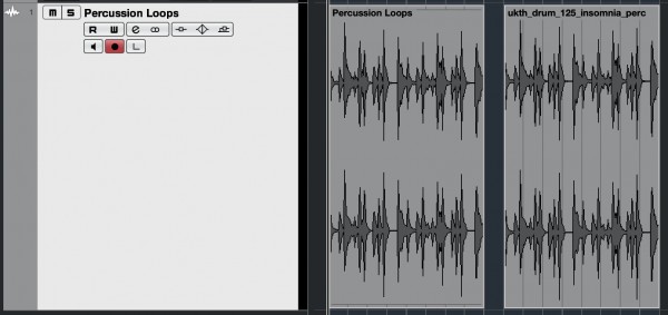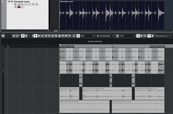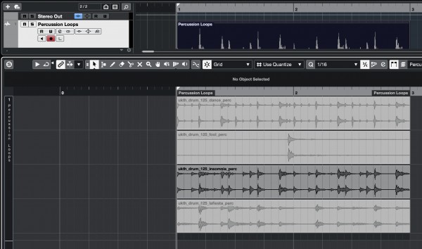 In the pic above, I sliced the various percussion loops into sections and interchanged them by activating small sections within the files. Notice the timeline above has updated to represent the combination of the active sections. Section in light-grey are inactive and will not play.