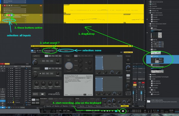 i simply have to 1.)drag & drop the presence instrument into the track-window, 2.) find a bass-sound, 3.) activate the recording/solo/listen buttons and then 4.) start recording by klicking on the record button at the bottom.