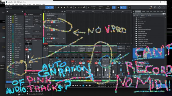 The audio track seems to be automatically created and assigned the color of pink.  There are also problems controlling these tracks from the mix window.  And here is something I found very baffling indeed, I am seeing the vacuum (air music synth vst) on a track in the mix window, which can't be enabled for record (record midi) and then in the shown image I next to the vacuum track you see the old (instrument has been removed but name has not been changed yet) pink instrument track I got when I tried to create an audio track for a waves piano (grhapsod).  This track was created automatically when I attempted to make that audio track for the vi piano.